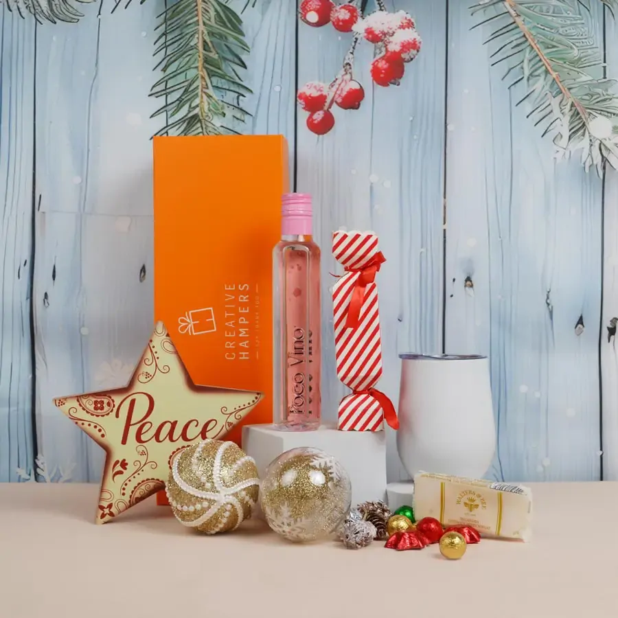 Featuring an insulated wine tumbler to hold the gorgeous drink sized bottle of Poco Vino rose wine (187ml), so that you can enjoy it on the go!  The hamper also includes some sweet snacks - Macadamia Honey Nougat and a Christmas bonbon containing individual foil wrapped Chocolatier chocolates.